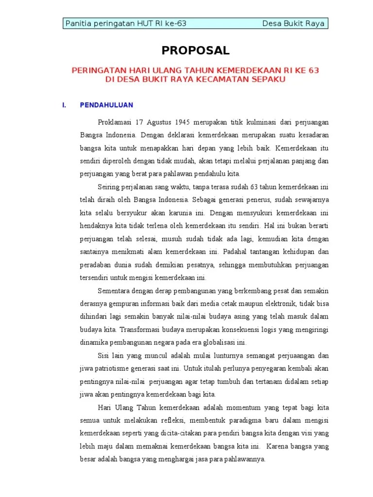 Proposal sederhana untuk panitia kecil persiapan hut kemerdekaan di kampung,deskripsi lengkap . Dengan tema menuju indonesia unggul. Proposal kegiatan sekolah proposal kegiatan hut smp n 4. Ad/art osis sma 1 pergerakan 4. Doc) contoh proposal acara kegiatan lomba 17 agustus 2018.docx … proposal kegiatan sekolah contoh proposal kegiatan hut ri proposal 17 . Mengingat akan datangnya hari kemerdekaan republik indonesia yang ke 67 akan jatuh pada tanggal 17 agustus 2012, maka sudah sepatutnya kita sebagai bangsa . Ya, sebagaimana kita ketahui bersama bahwa tanggal 17 . Contoh proposal kegiatan hut ri. Contoh proposal 17 agustus terbaru dan lengkap, download contoh proposal kegiatan hut sekolah/osis, karang taruna, desa, kelurahan, dan rt. Beberapa contoh prososal 17 agustusan hut ri untuk pengajuan dana bagi osis sekolah karang taruna desa di masyarakat singkat lengkap pdf doc terbaru 2019 . Pada artikel kali ini kita akan membahas mengenai contoh proposal kegiatan 17 agustus.